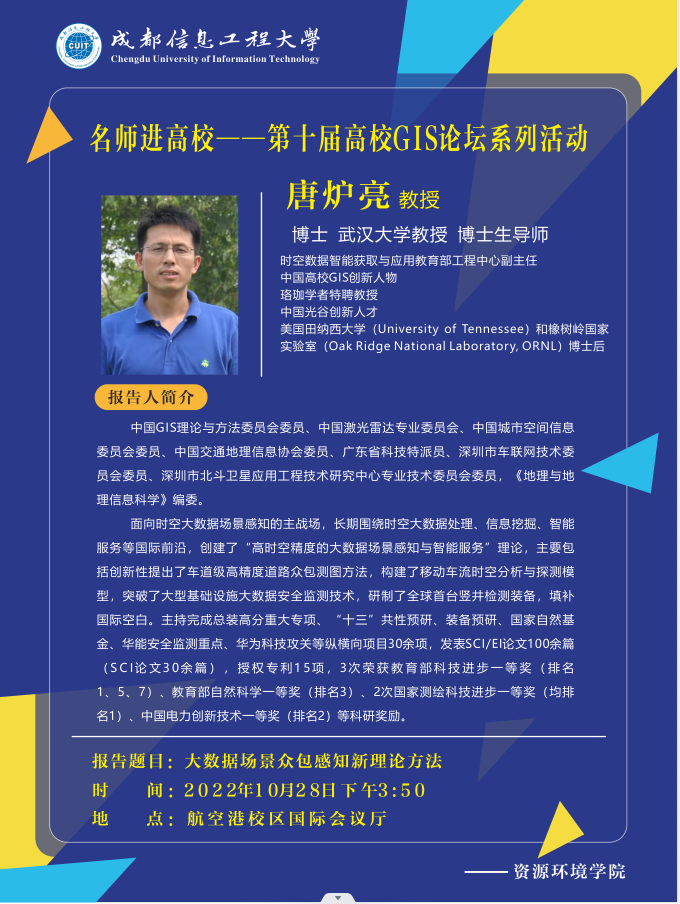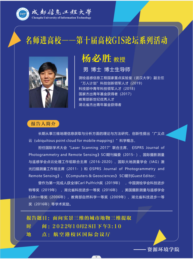 10月28日下午,杜培军教授、杨必胜教授和唐炉亮教授从遥感、实景三维、大数据场景感知等领域进行了三场学术讲座。