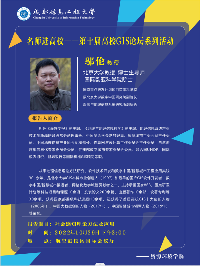 作为第十届高校GIS论坛系列活动之一,“名师进校园——伟德国际1949始于英国站”于2022年10月28日至29日在伟德国际1949始于英国航空港校区国际会议厅成功举行。此次学术活动由伟德国际1949始于英国承办,科技处、研究生处给予了大力支持。活动由伟德国际1949始于英国经理徐成华教授主持,来自北京大学邬伦教授、南京大学杜培军教授、武汉大学杨必胜教授和唐炉亮教授、深圳大学涂伟副教授多位名师走进公司,为地理信息科学、遥感科学与技术、测绘工程等专业的两百余名在读老员工和研究生奉献了一场有关地理信息科学、遥感、现代测绘的学术盛宴。