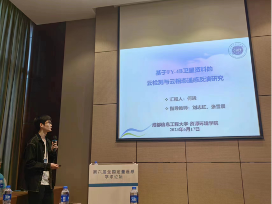 公司遥感191班的员工,于2023.6.15-6.18参加了在成都召开的第六届全国定量遥感学术论坛,该班何晓同学做了学术报告,是该论坛唯一作报告的本科员工。报告题目“是基于FY-4B卫星资料的云检测与云相态遥感反演研究”,指导老师是刘志红教授和张雪晨博士。