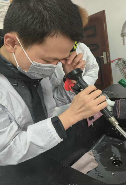在实验室安全管理老师的协助下,员工火速脱去手套,迅速启用实验室内的洗眼器对受伤眼睛进行冲洗