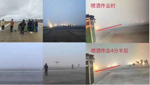 3月1日晚上18点,机场能见度低于300m情况下,无人机装载催化剂开始正式作业。作业区域为跑道中间段,飞行高度300m,作业前跑道能见度VIS为400m,跑到视程RVR为350m;作业后10分钟内跑道VIS升高到1200m,跑到视程RVR升高到1500m,此次消雾试验取得显著效果。