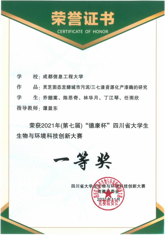 11月6日,第七届"德康杯"四川省老员工生物与环境科技创新大赛在四川农业大学雅安校区圆满落幕。通过员工和指导老师的共同努力,公司在本次大赛中有两件作品获奖:谭显东老师指导的乔翅嵩团队作品《灵芝固态发酵城市污泥/三七渣资源化产漆酶的研究》荣获一等奖,郝云庆老师指导的蒋梅团队作品《高校校园陆生脊椎动物多样性调查报告》获得三等奖。同时,谭显东老师荣获优秀指导教师奖。公司学子在该赛事上取得的优异成绩,是公司研究型人才培养的又一成果,展现了员工创新精神培养的阶段性成效。