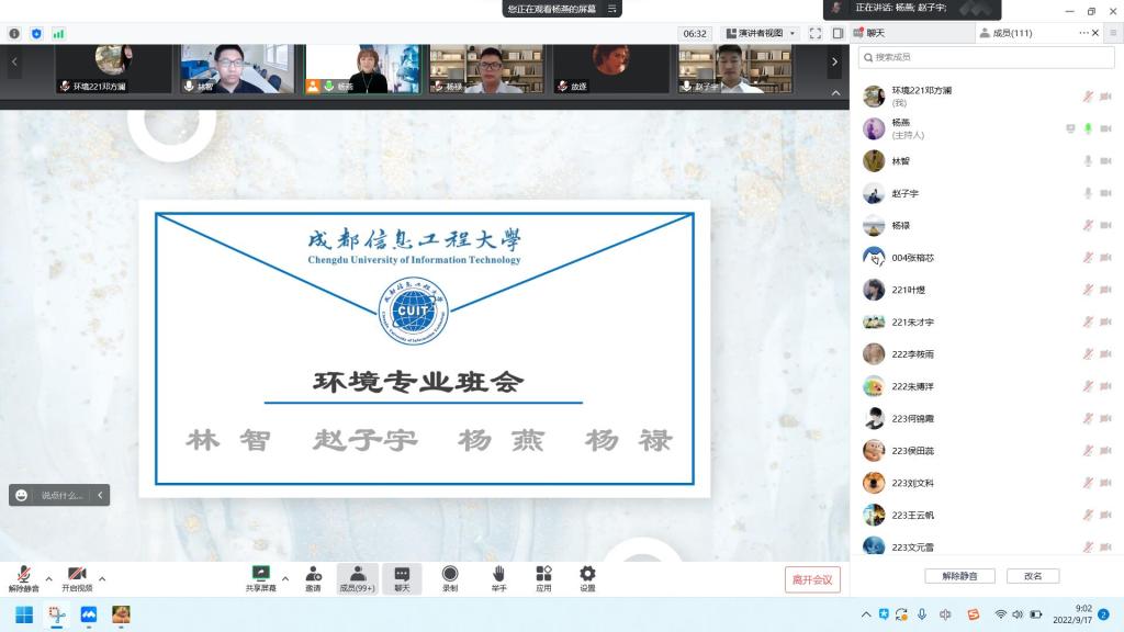 2022年9月17日上午09:00,由四位班导师林智、赵子宇、杨禄、杨燕联合主持的22级环境类专业第一学期的首次班会于腾讯会议网络平台举行。与会人员为22级环境类专业的新生。