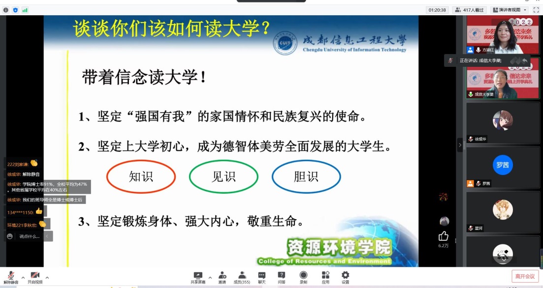 典礼进行第四项,资环公司优秀教师代表刘志红老师发言。刘志红告诉同学们在资环公司会遇到各类课程,会遇到优秀的同学,老师以及领导。她表示同学们刚刚进入大学,一切都是新征程的起点,一切都是新的可能,期待早日在成信大校园中与同学们会面。