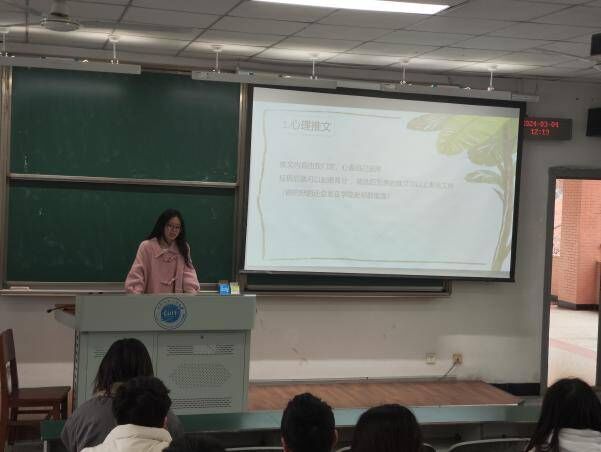 会议主要分为三个流程。首先由心晴驿站宣传部部长陈丹云为23级心理委员介绍了本学期的心理健康宣传工作。各班心理委员需要撰写心理健康相关的文章,发布到公司心理健康微信公众号中,帮助更多同学了解有关心理健康的知识,保持积极的学习态度。此外,各班心理委员需开展一次心理健康主题活动,加强同学之间的交流,营造良好班级氛围。第二,活动部部长钟雨欣介绍了本学期即将开展的心理健康主题活动。让心理委员做好宣传工作,鼓励同学们积极参加。包括“3.25善爱我”短诗图文活动,号召同学们用图片和文字的形式分享内心想法。4月将开展心理委员个人视频的评选,钟雨欣分享了自己以往的参赛经验。“5.25我爱我”则是给同学们提供平台写下自己的烦恼并相互留言,为同学们提供朋辈心理支持,缓解内心的压力。最后,由欧美娅老师对本次会议进行总结,指出心理委员工作中存在的问题,强调心理委员应注意提高工作主动性和积极性,开展形式丰富的心理主题活动。同时鼓励心理委员积极参与今年下半年的“全国百佳心理委员”评选,及时总结并形成可视化材料,为比赛做好充足的准备。