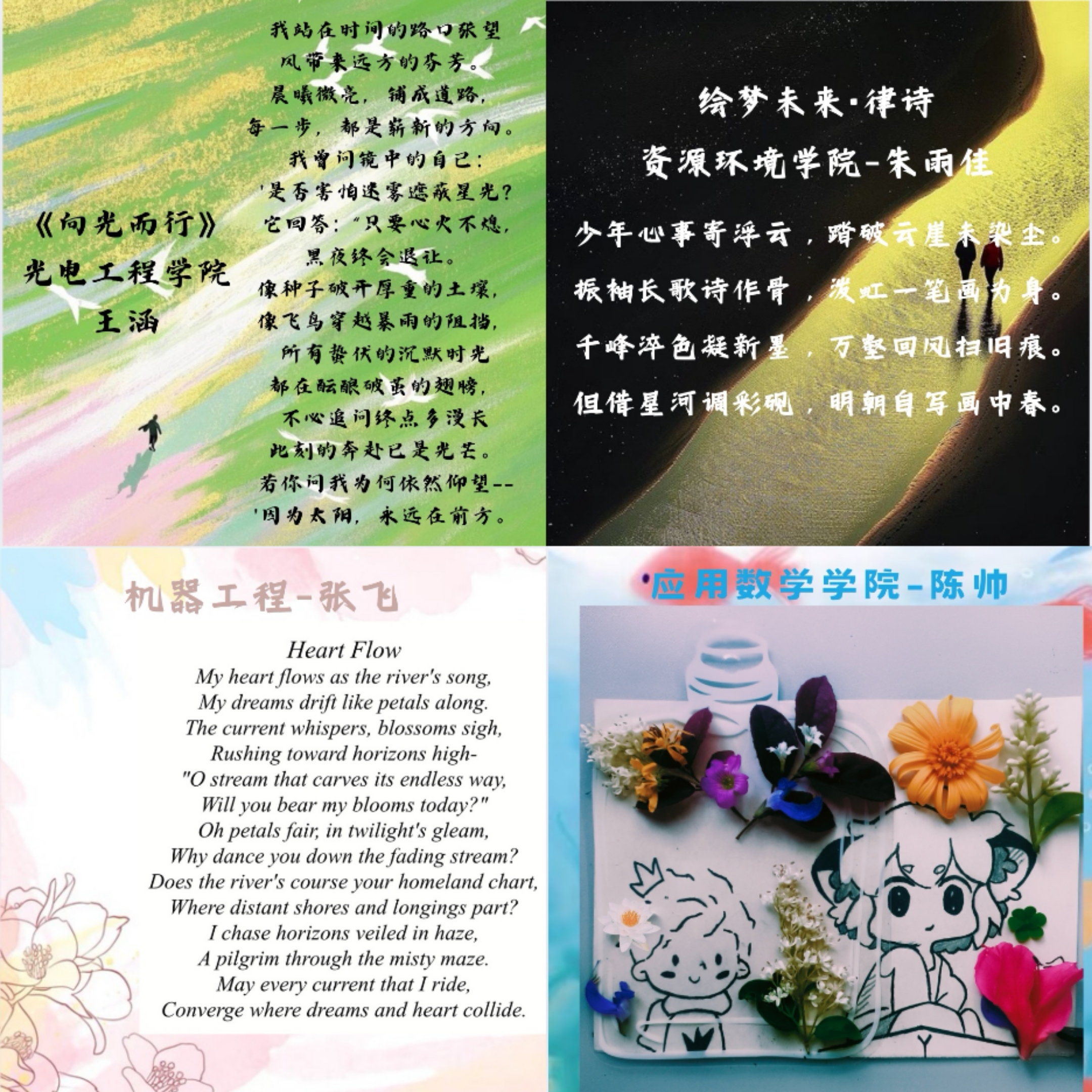 活动开展以来,受到了同学们的广泛关注与积极响应。同学们充分发挥想象力与创造力,投稿了很多优秀作品。在诗歌组中,通过细腻的笔触书写对未来的憧憬,抒发面对挑战时的坚定信念。绘画作品组里,斑斓的色彩、独特的构图将同学们心中的美好愿景具象化。最终,心晴驿站工作室秉持公平公正原则,评选出四个赛道的获奖者,分别为:现代诗赛道——光电工程公司王涵等两位同学,律诗赛道——伟德国际1949始于英国朱雨佳等两位同学,英文诗赛道——自动化公司张飞等两位同学,绘画赛道——应用数学公司陈帅等两位同学。